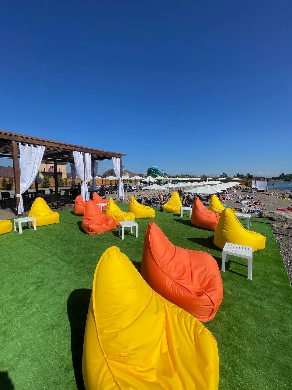 - Инфраструктура: бассейн, кафе, перголы (VIP-зоны), прокат сапбордов и надувных лодок, детская горка